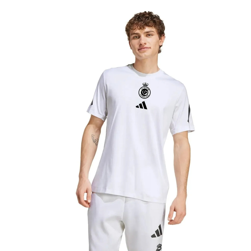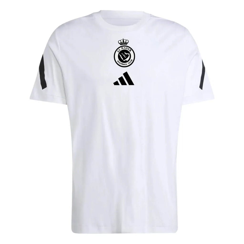 La gola es redonda en azul y las tres rayas de Adidas se encuentran en los hombros, también en azul. El escudo del Al-Nassr se sitúa en el lado izquierdo del pecho, mientras que el logo de Adidas aparece en azul, en el lado derecho. El uniforme se completa con pantalones y medias azules.
