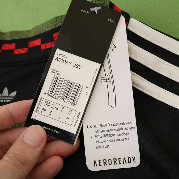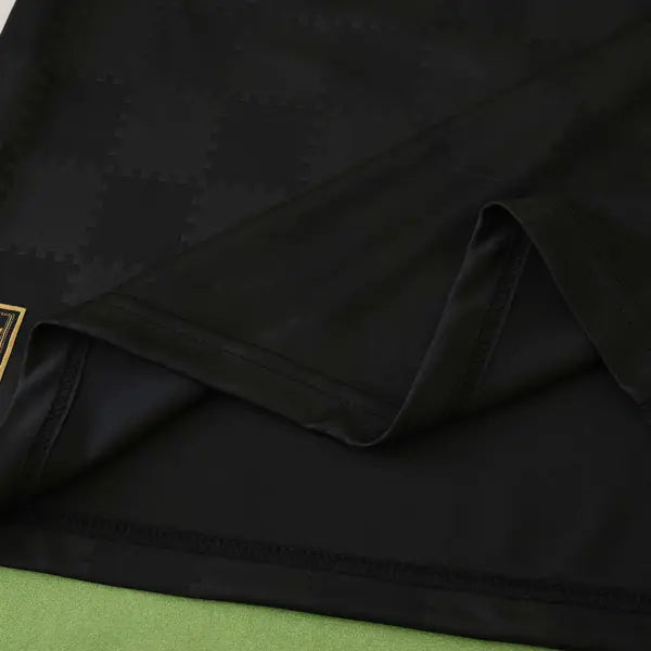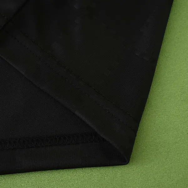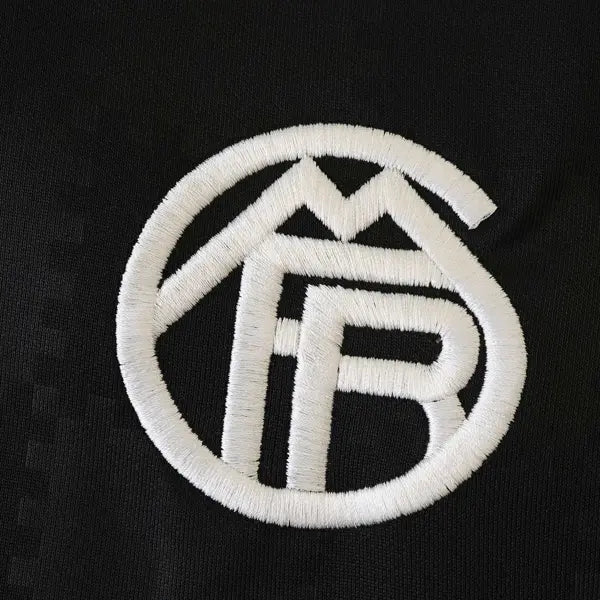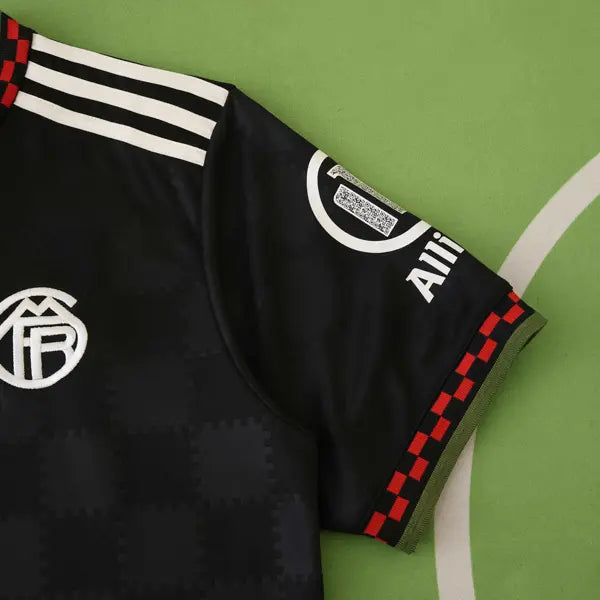 La nueva tercera camiseta del Bayern de Múnich destaca por su diseño moderno con detalles únicos que la hacen destacar. El color principal es el gris oscuro, con detalles en rojo y azul. La camiseta incluye un patrón sutil en el pecho que evoca el escudo del equipo, con un diseño inspirado en los años 90, que recuerda a las camisetas de la época.