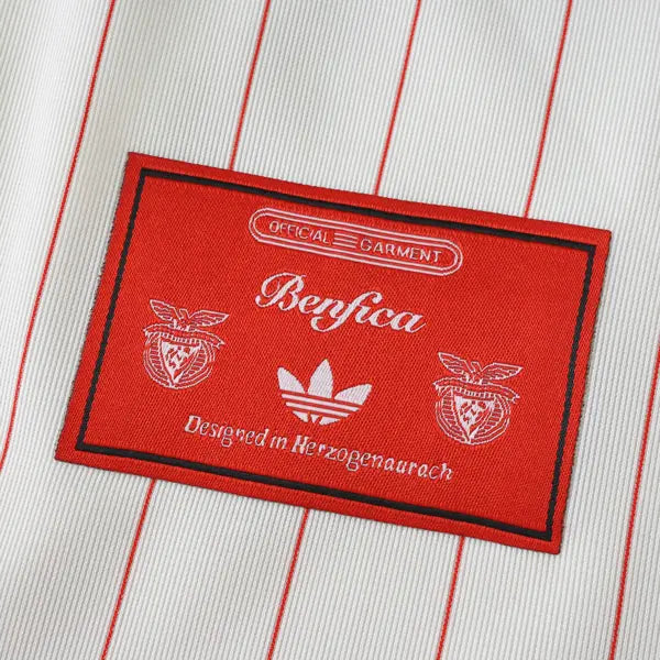 La nueva camiseta titular del Benfica mantiene un diseño clásico con un toque moderno. El color principal es el rojo, color tradicional del club, con detalles en blanco. El diseño incluye un patrón sutil en el pecho que evoca el escudo del equipo. La gola es redonda en blanco y las tres rayas de Adidas se encuentran en los hombros, también en blanco. El escudo del Benfica se sitúa en el lado izquierdo del pecho, mientras que el logo de Adidas aparece en el lado derecho, en blanco. El uniforme se completa con pantalones blancos y medias rojas.