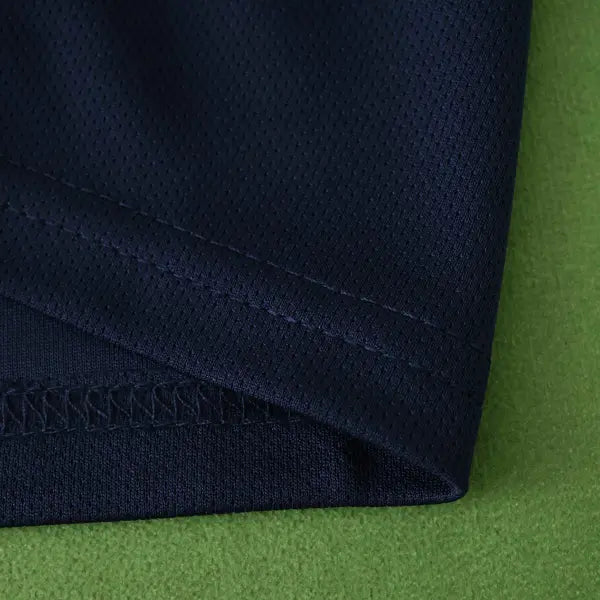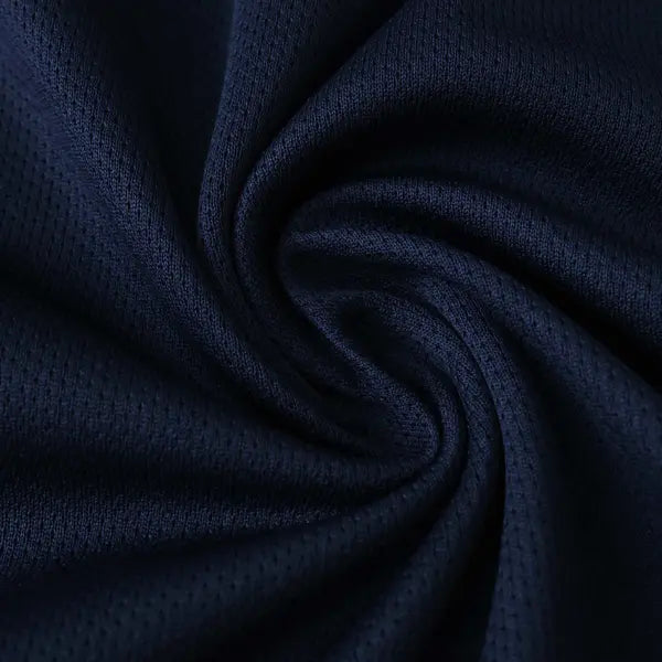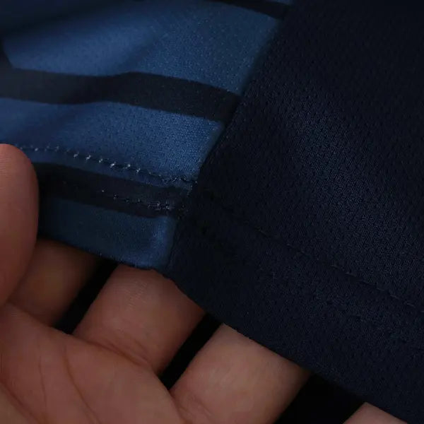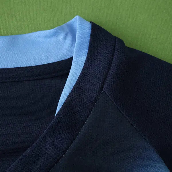 El cuello en V es blanco, dividiéndose en la parte frontal con el azul marino, un patrón que se repite en los puños, que complementan las mangas negras.