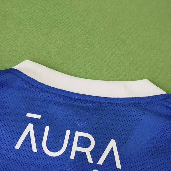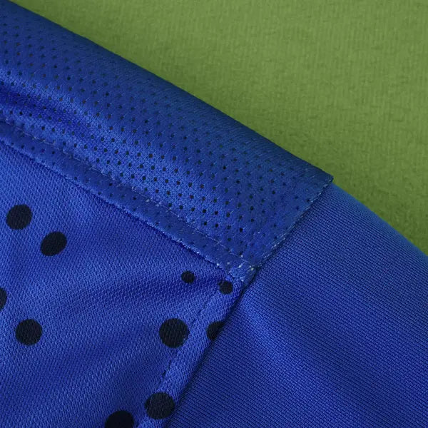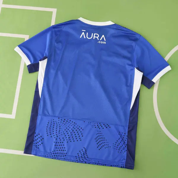El Portsmouth ha presentado su nueva camiseta de visitante para la temporada 2024-2025 en la Championship. La camiseta combina una base negra con aros dobles en hiper-turquesa, creando un diseño moderno y elegante. Los puños y el cuello también son de color hiper-turquesa, complementando el look.