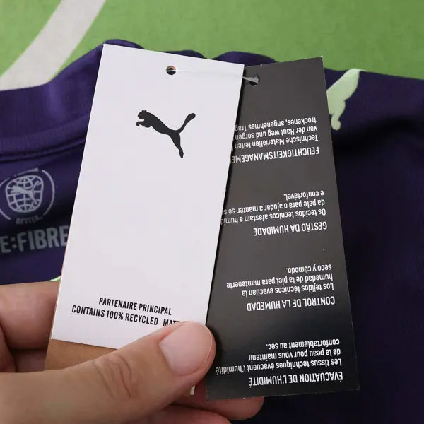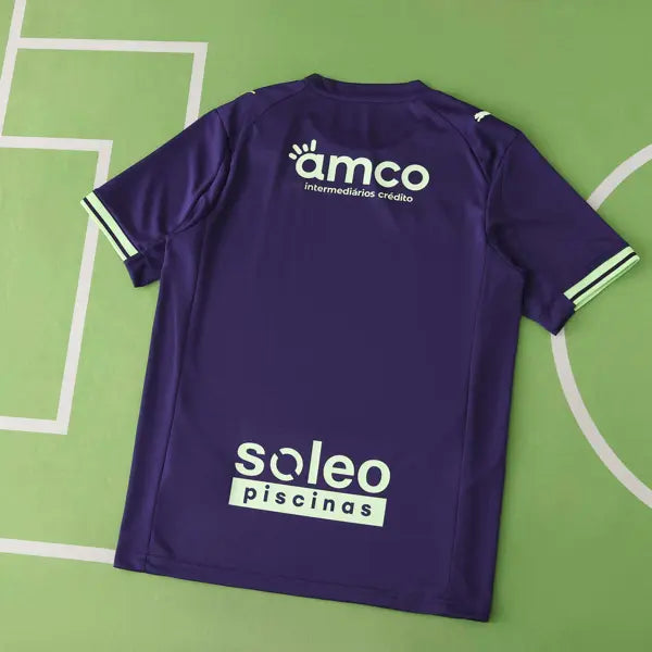 La nueva camiseta titular del Sporting BBraga presenta un diseño clásico con un toque moderno. El color principal es el verde, color tradicional del club, con detalles en blanco. El diseño incluye un patrón sutil en el pecho que evoca el escudo del equipo. La gola es redonda en blanco y el Swoosh de Nike se encuentra en los hombros, también en blanco. El escudo del Sporting Braga se sitúa en el lado izquierdo del pecho, mientras que el logo de Nike aparece en el lado derecho, en blanco. El uniforme se completa con pantalones blancos y medias verdes.