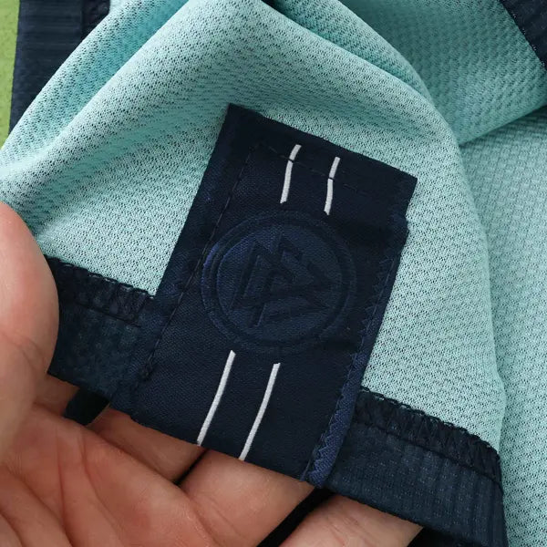 El escudo de la DFB se aplica en magenta con elementos blancos, en el lado izquierdo del pecho, mientras que el logotipo de Adidas va en el lado derecho, en el mismo color.