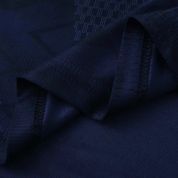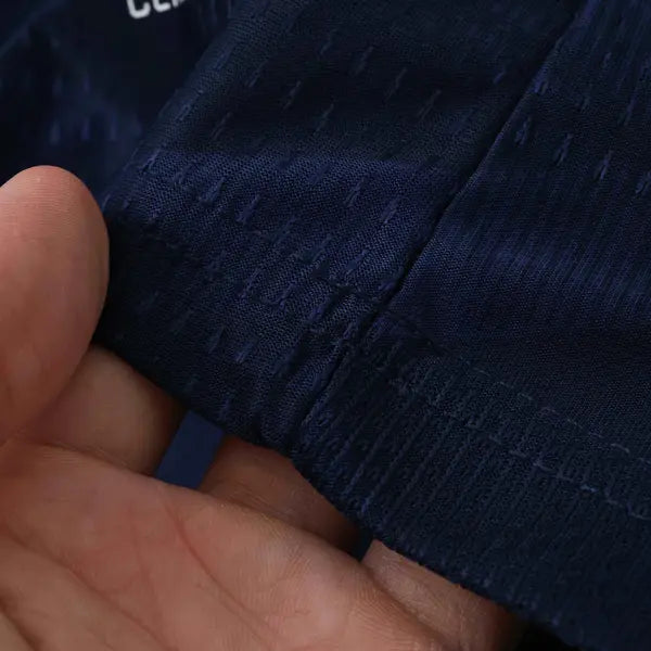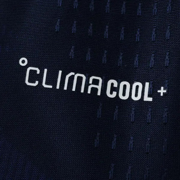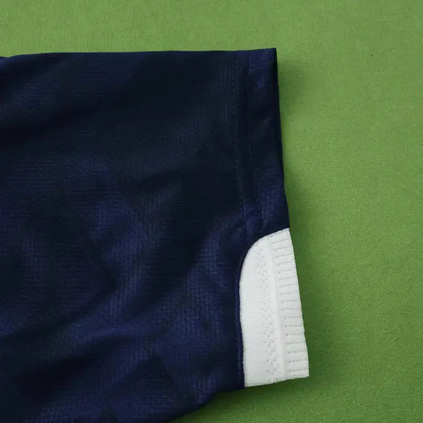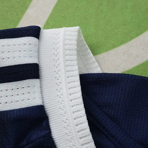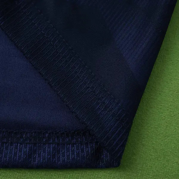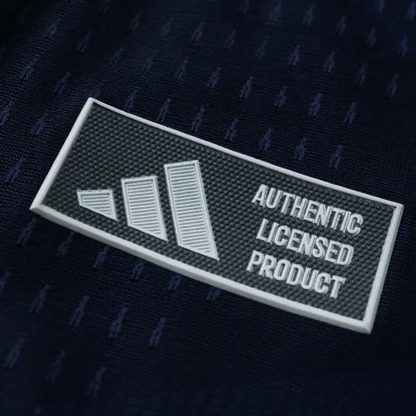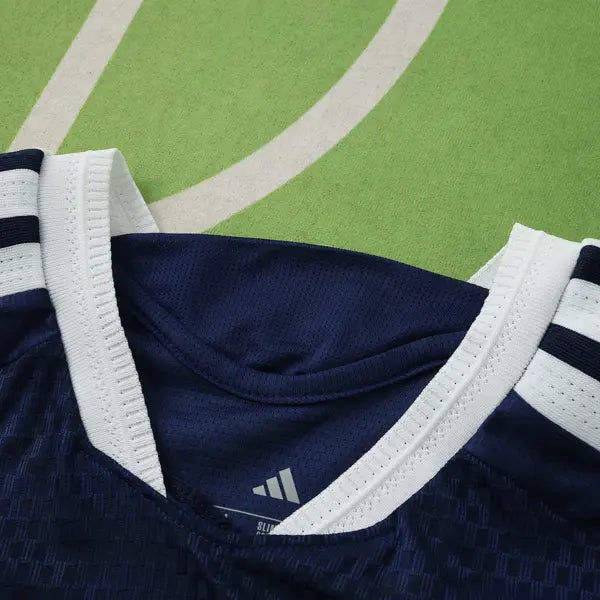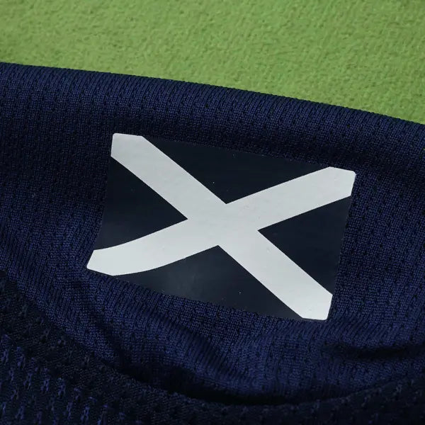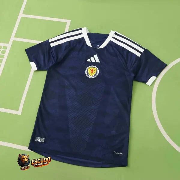La nueva camiseta titular de Escocia presenta un diseño moderno y elegante. Predomina el color azul marino con detalles en blanco. El diseño incluye un patrón de líneas diagonales en blanco en la parte frontal, que aporta un toque dinámico al uniforme. La gola es redonda en blanco, con detalles en azul marino. Las mangas también son azules, con detalles en blanco en los bordes. El escudo con el león de Escocia se ve en el lado izquierdo del pecho, mientras que el logo de Adidas también tiene el color blanco. El uniforme para juegos como mandante del equipo escocés se completa con pantalón blanco y calcetines azules.